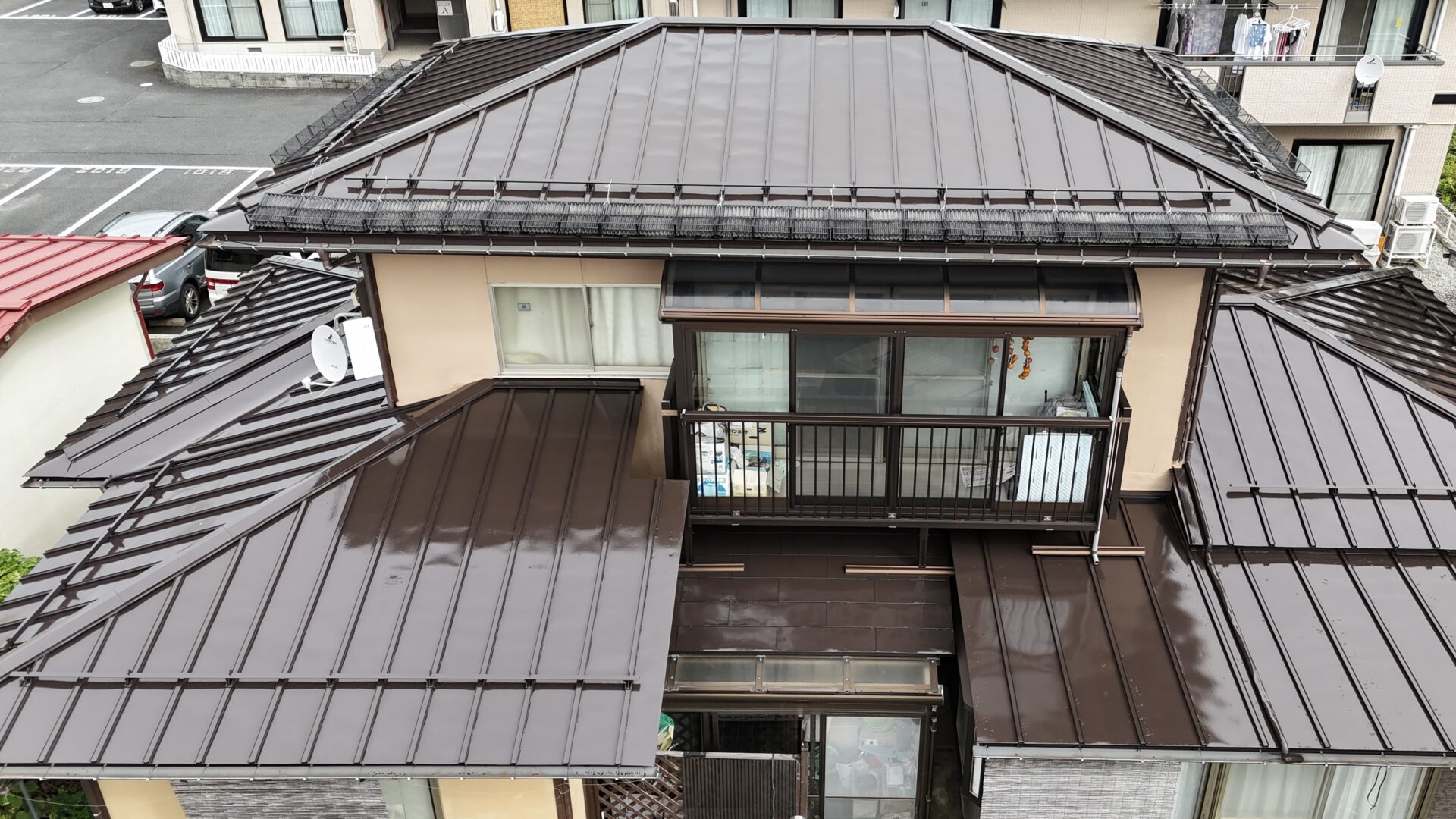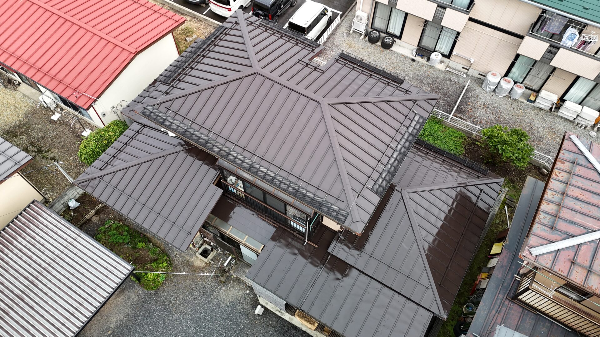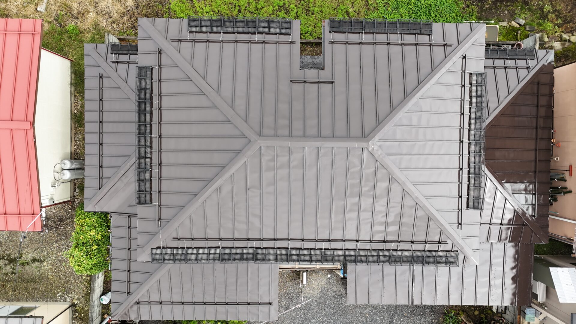 屋根にサビや剥がれが発生しており心配されてましたが、古い弱った塗膜とサビを除去してから3度塗りで施工させていただきましたので、