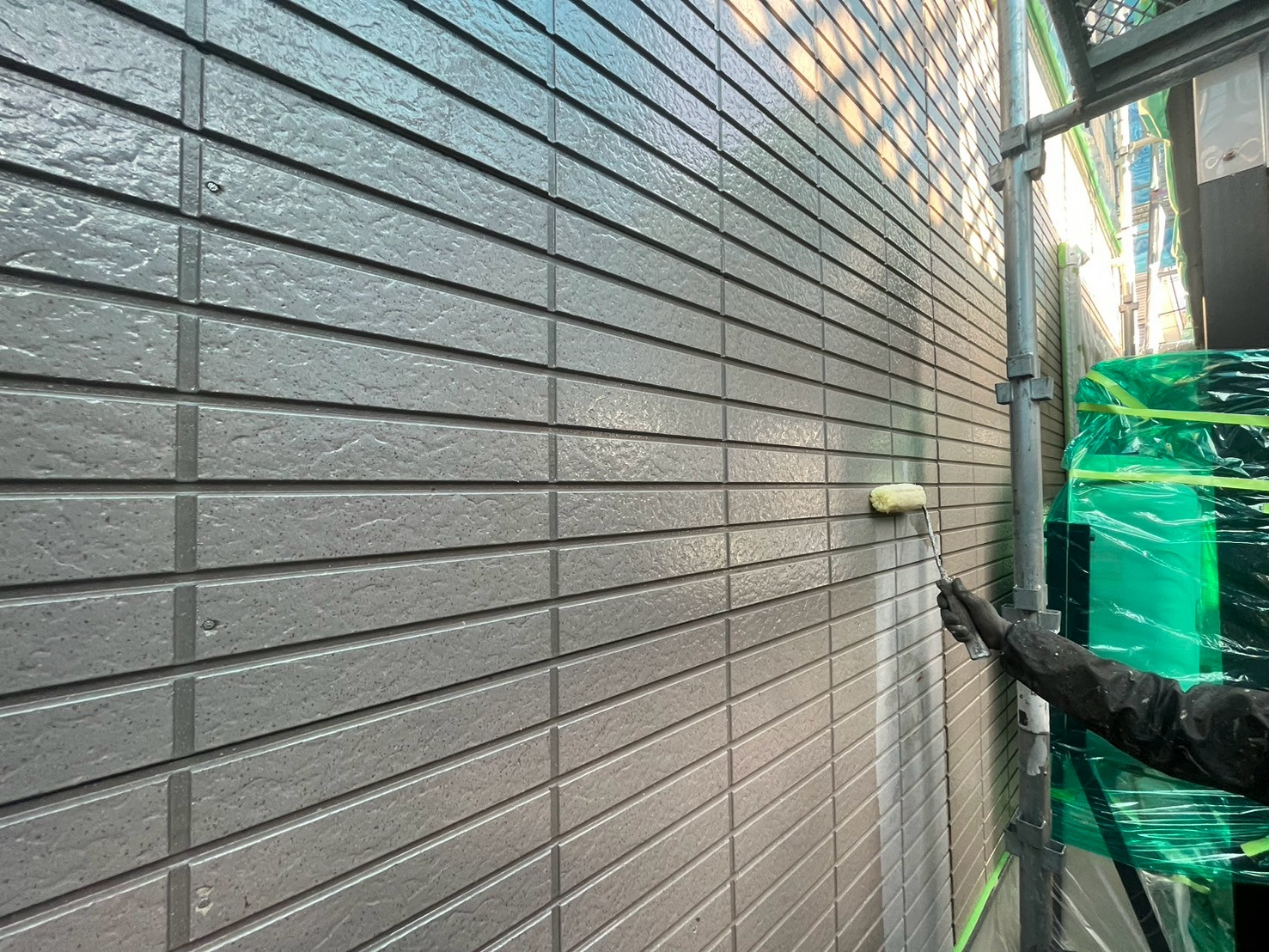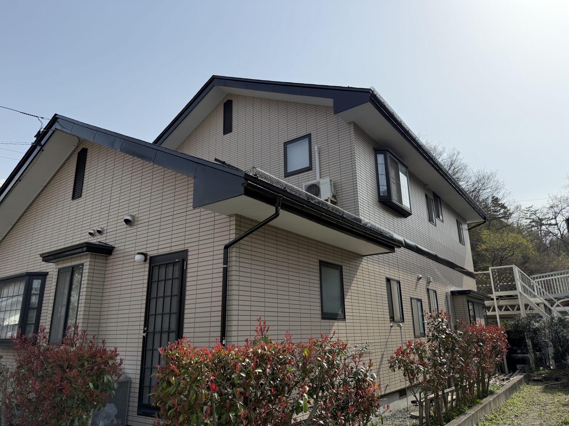なるべく長持ちさせたいと希望されていましたので日本ペイントのグランセラトップをダブルトーン工法で、下塗り2回、上塗り3回の5度塗りで仕上げさせていただきましたので、当分は安心かと思われます。