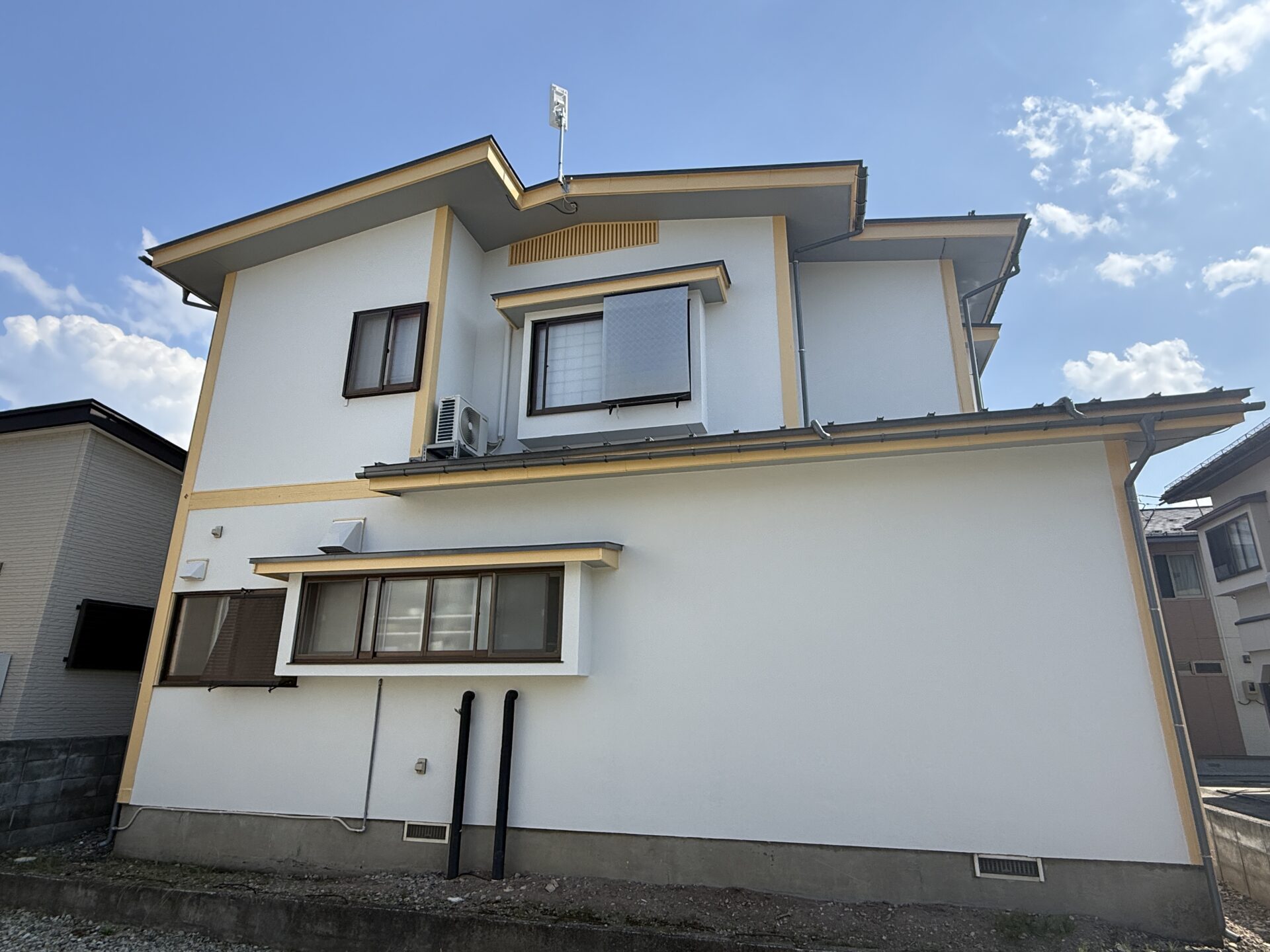 施工前気にされていた外壁の汚れですが、既存のリシン壁にゆず肌模様にパターン付けしましたので、今後汚れも付きにくいかと思われます。