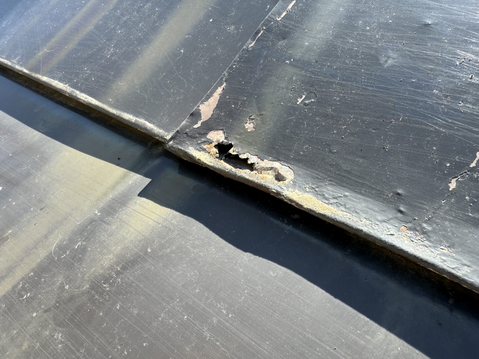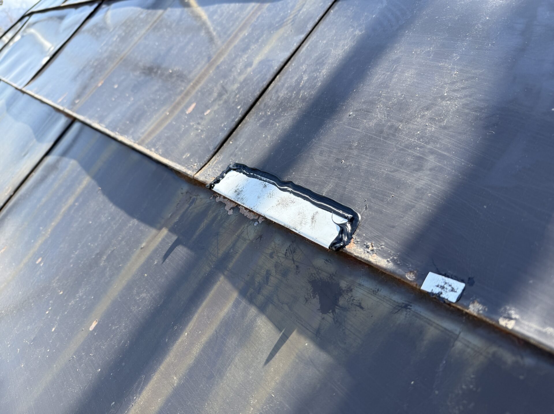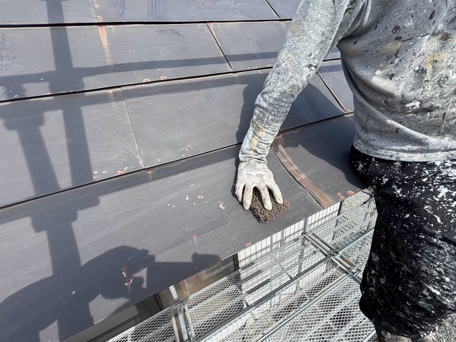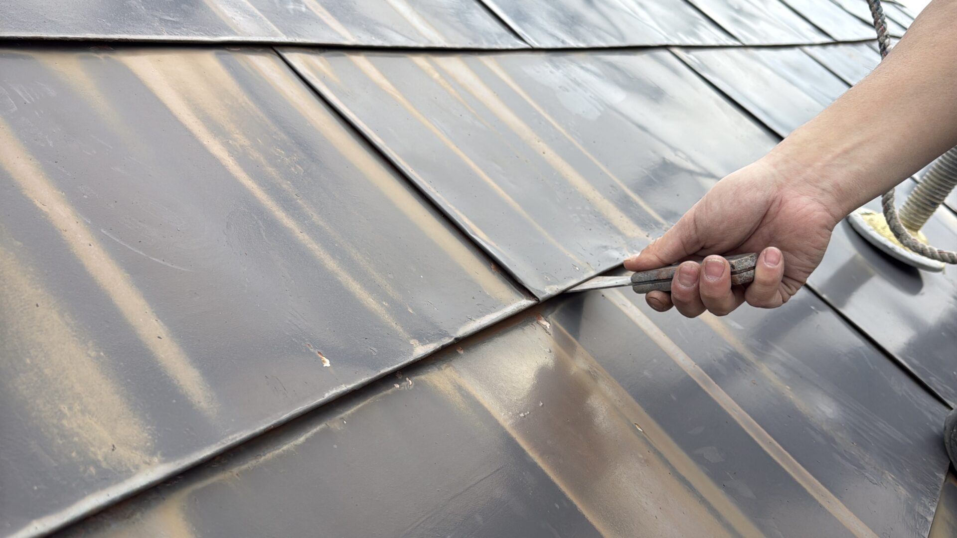 屋根のハゼから錆汁が流れていたのでハゼを起こしてあげて、ハゼの中にサビシャットを入念に塗装しました。