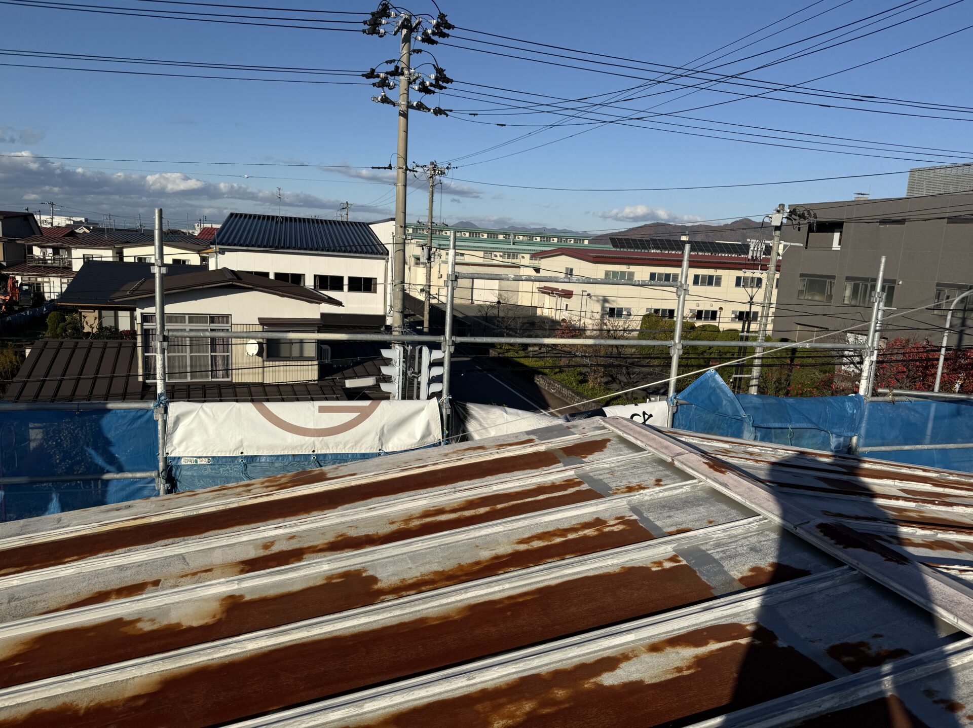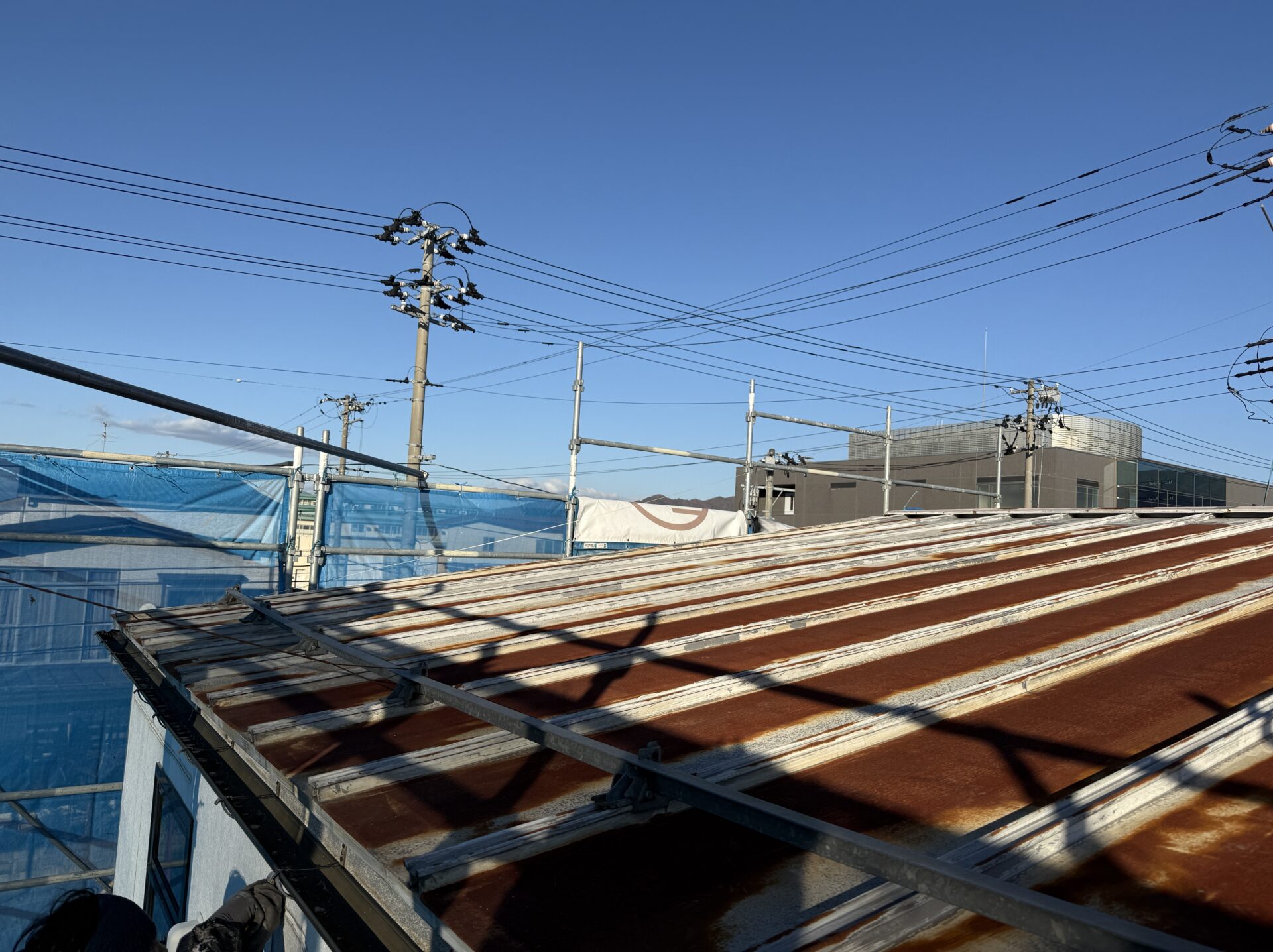 屋根の半分が錆による腐食。細かい穴があいており塗装工事では修復できない事を説明して、新たに金属屋根をカバー工事させていただきました。